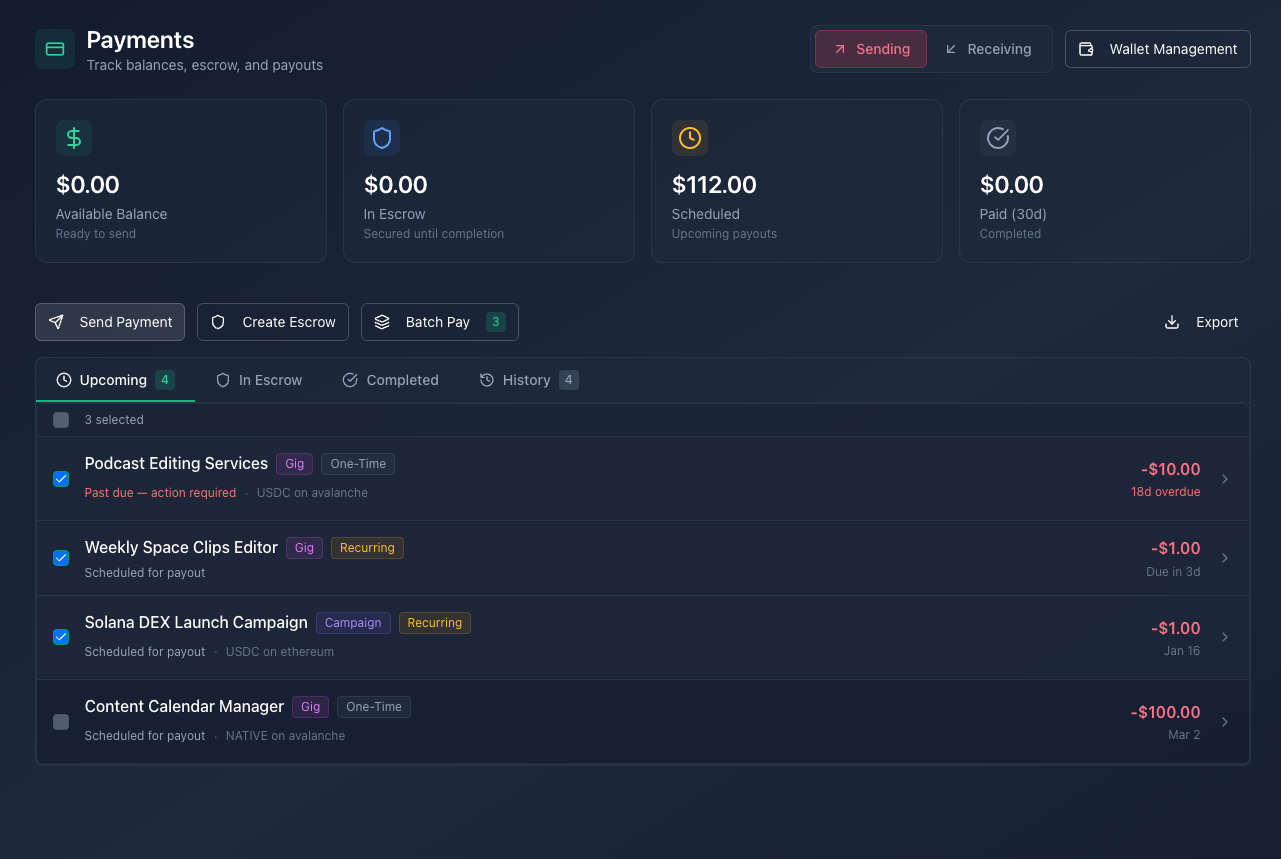 Pay multiple creators at once across campaigns and gigs — without manual tracking or payment overhead.
